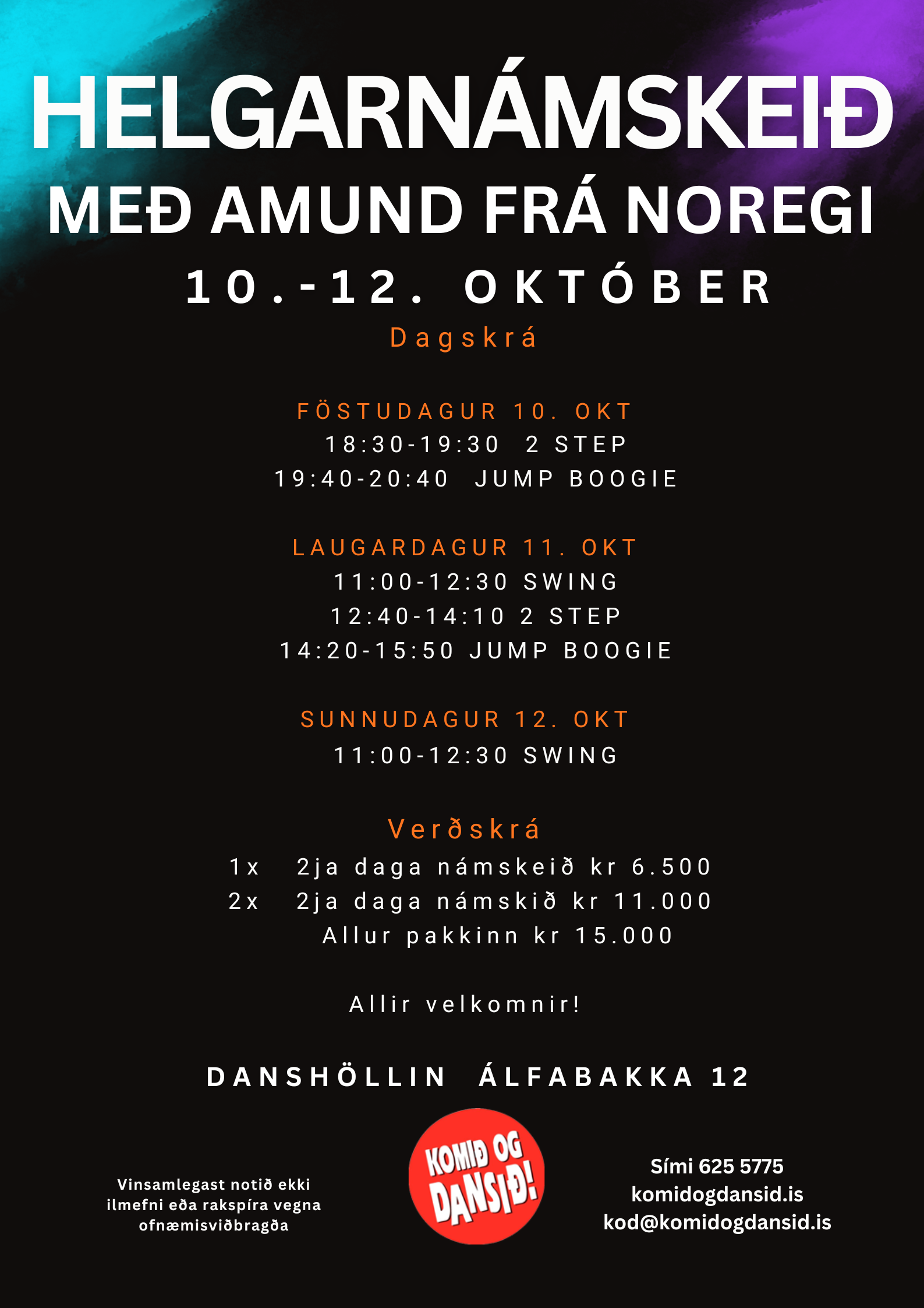 Frábært helgarnámskeið með Amund Storsveen frá Noregi. Ekki missa af þessu námskeiði. Amund er einn af bestu dönsurum Noregs. Hann mun leiðbeina og kenna helstu sporin í Swing.